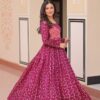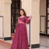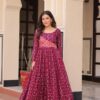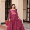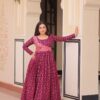 Elevate your ethnic wardrobe with this elegant cotton-lined Anarkali gown featuring a position print choli and staple jacquard weaving work. Designed with a flattering round neckline, full sleeves, and a 3-meter flair, it ensures comfort and style. Available in Rama and Wine shades, stitched to perfection with canvas patta for a graceful fall. Ideal for festive and special occasions.